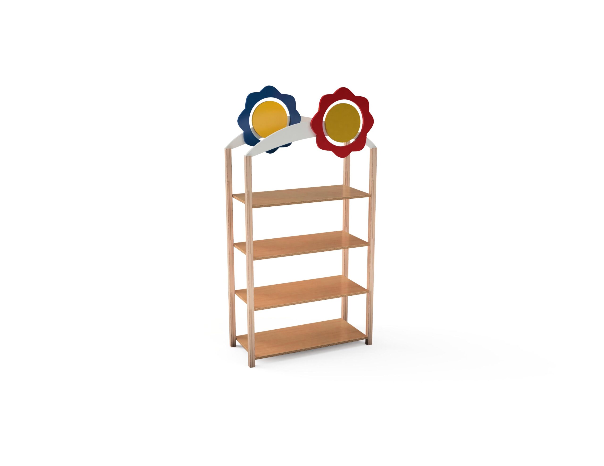 Polica s dekorativnim motivom cvjetova. Sadrži četiri police za spremanje raznog materijala. Praktična za sve prostore. Konstrukcija izrađen visoko kvalitetnog masivnog drva, a police i rubne trake po izboru iz palete boja. Spajano je bez vidljivih spojeva.