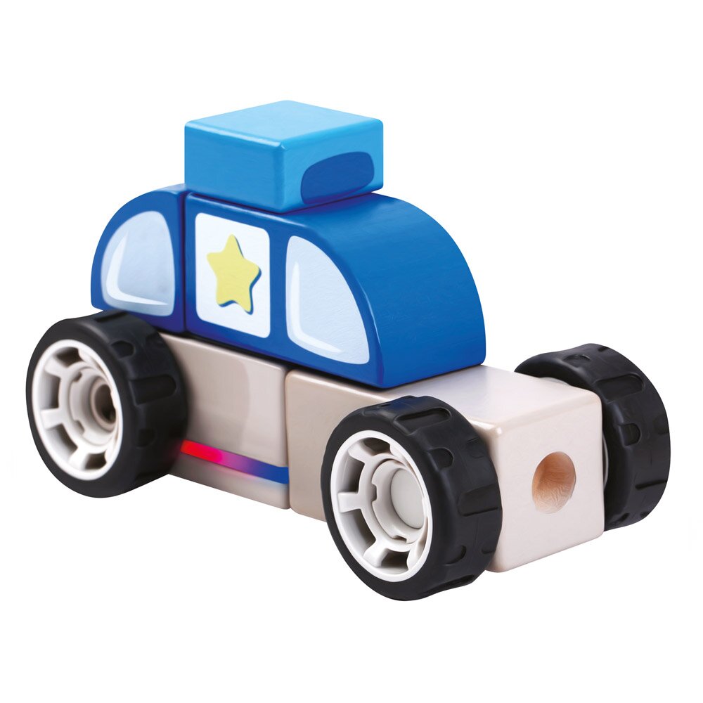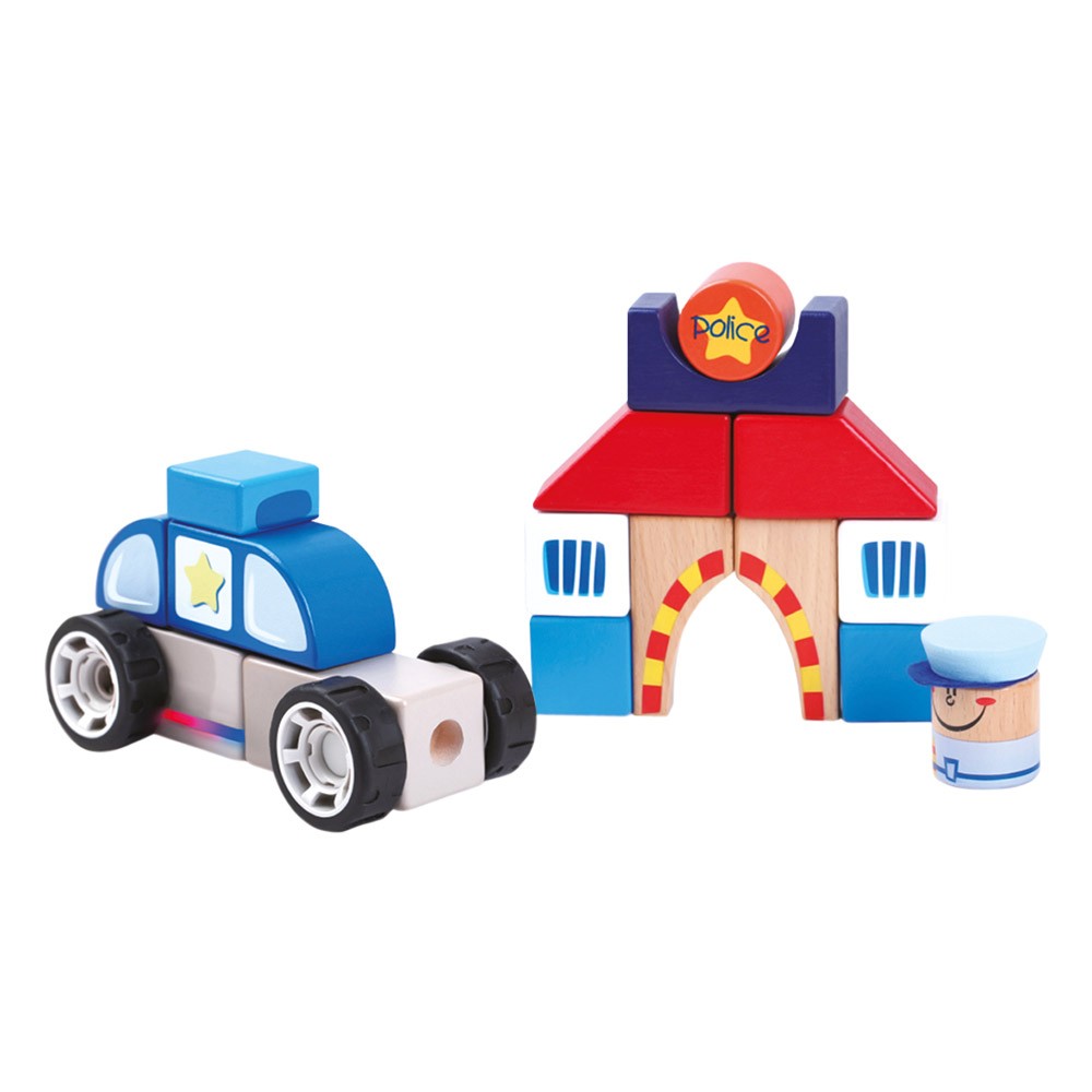 Drveni policijski automobil na baterije koji se slaže u blokove policijske stanice. Zabavna igračka za poticanje razvoja fine motorike. Igračka pomaže razviti svijest o igranju uloga i povećava interes za zanimanjem policajca.