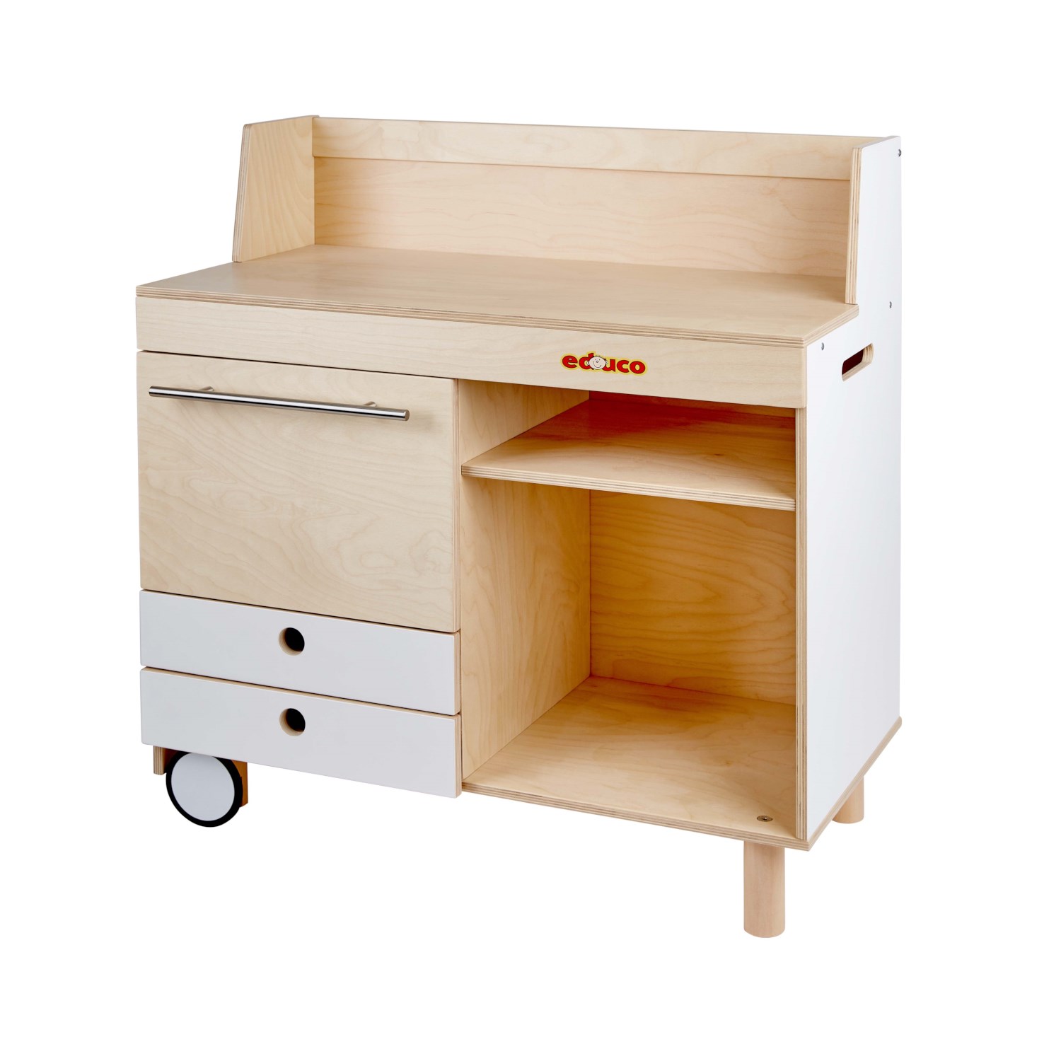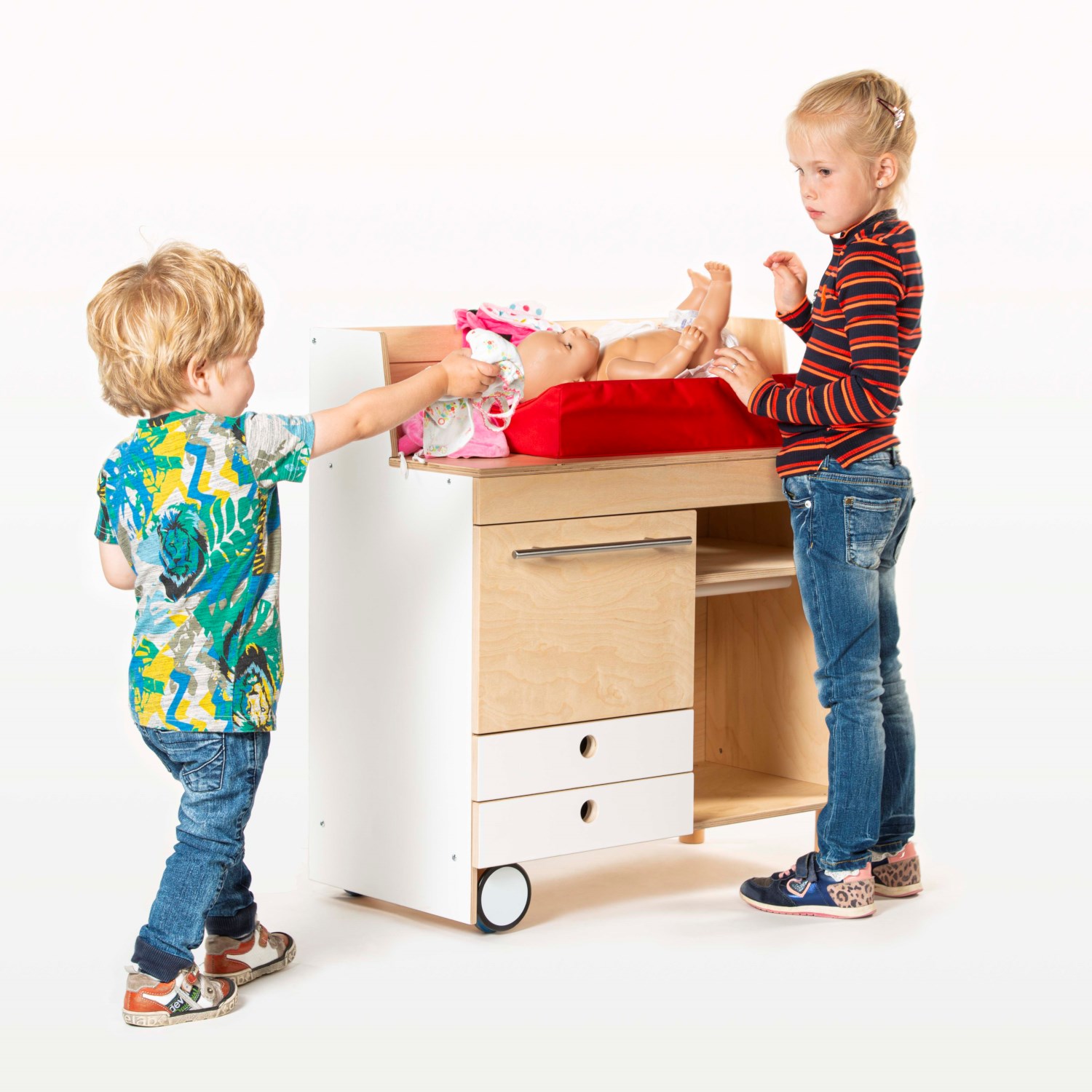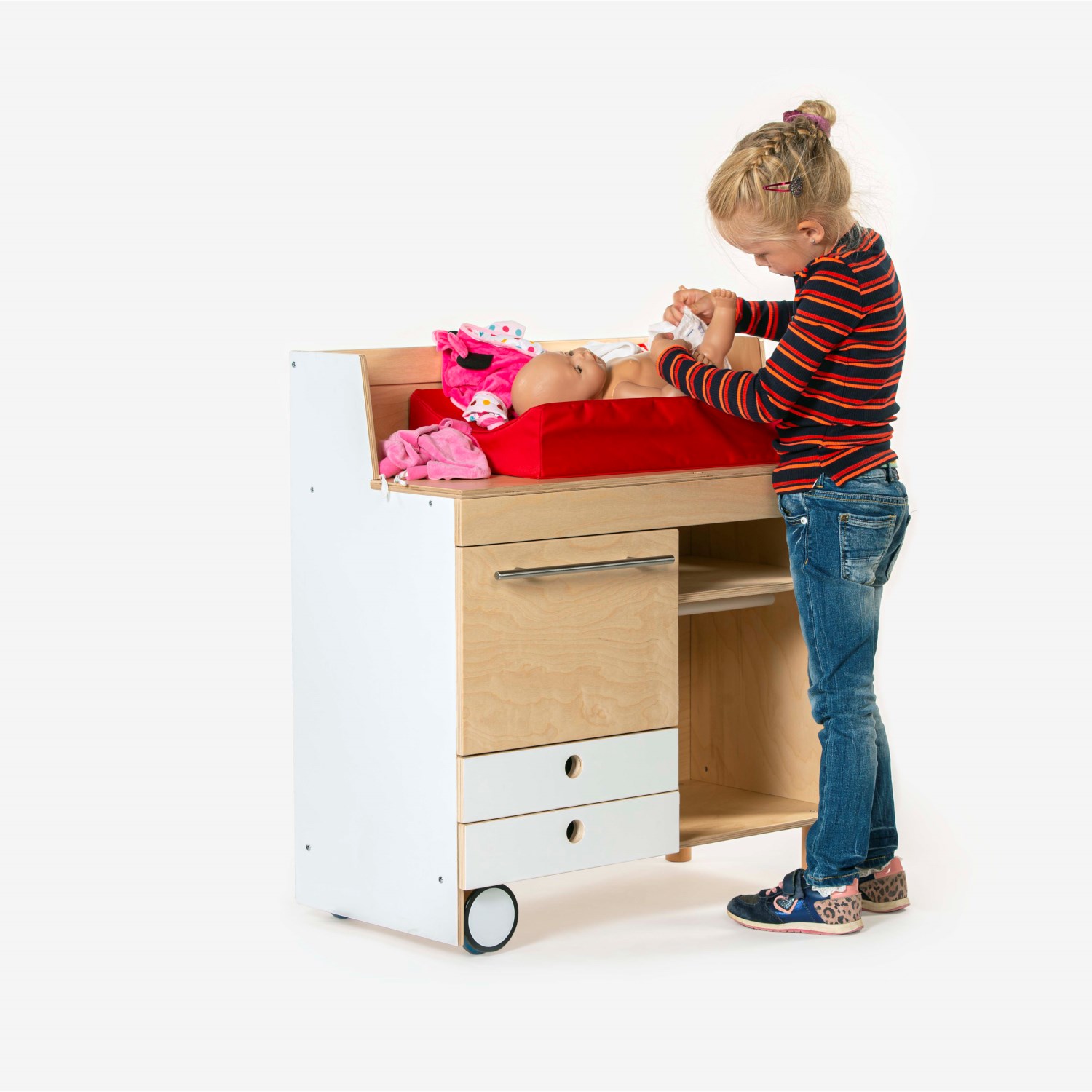 Prekrasan drveni ormarić za prematanje lutaka, s dvije ladice, prostorom za odlaganje pelena te malim garderobnim ormarom za odjeću s vratima. Sad se djeca stvarno mogu posvetiti svojim bebama i mijenjati im pelene poput njihovih mama. Pult dolazi s 2 kotača za lakše pomicanje. Dodatak E523024: Jastuk za prematanje.