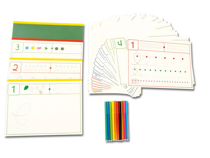 Radni listovi za grafomotoriku uključuju 30 kartica u boji, 10 perivih markera i 4 plastične datoteke.