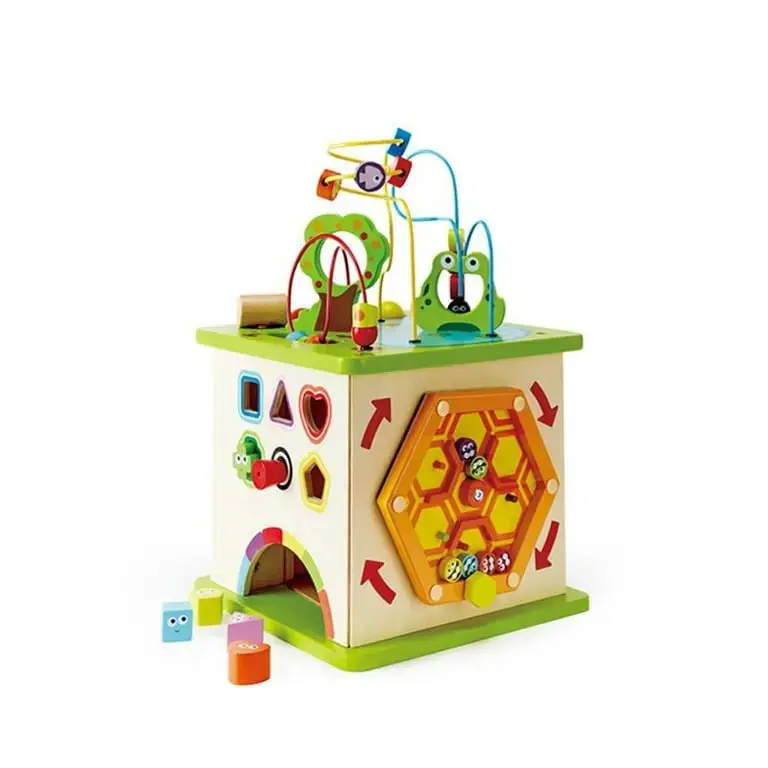 Labirinti, okretna ploča, umetaljka, oblici, poluge i različita stvorenja koja lete, plivaju ili krekeću čine šarenu motoričku kocku od pet strana centralnom aktivnosti za djecu. Motorička kocka insprirana je životinjama. Potiče razvoj motoričkih vještina, logičkog razmišljanja, ustrajnosti, vizualne percepcije.