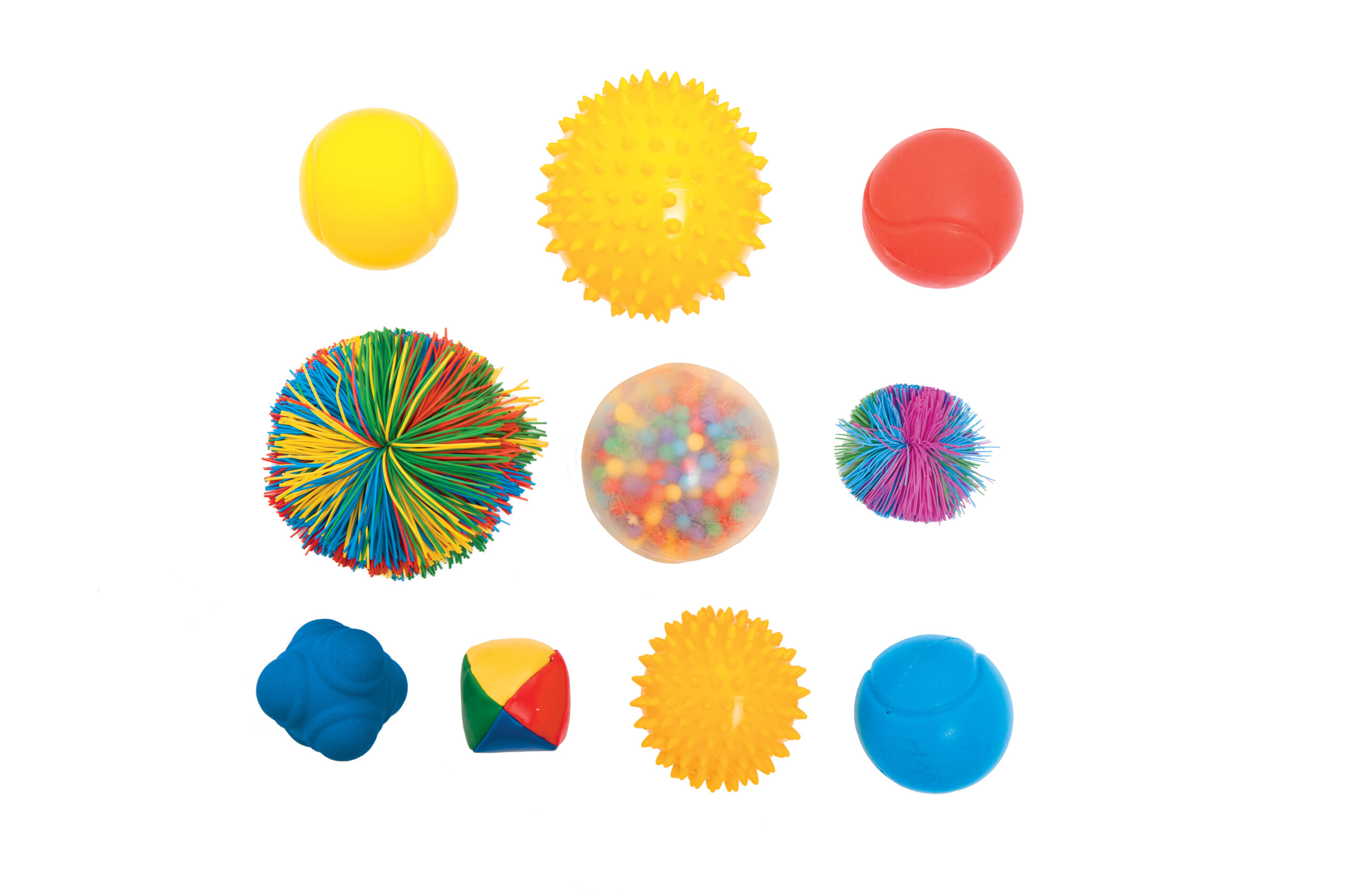 Set od 10 senzornih loptica: kuglice od perle, kuglice od pjene, hrapave lopte, kocke, cirkuske lopte, paučne loptice, vrećica za materijal. Loptice privlače dječju pažnju i znatiželju. Oblici su idealne veličine za hvatanje i držanje, svaki oblik ima različitu teksturu. Igračka pomaže bebama istražiti teksture i vježbati finu motoriku, koordinaciju ruku i očiju, prepoznavanje boja i oblika i dr.