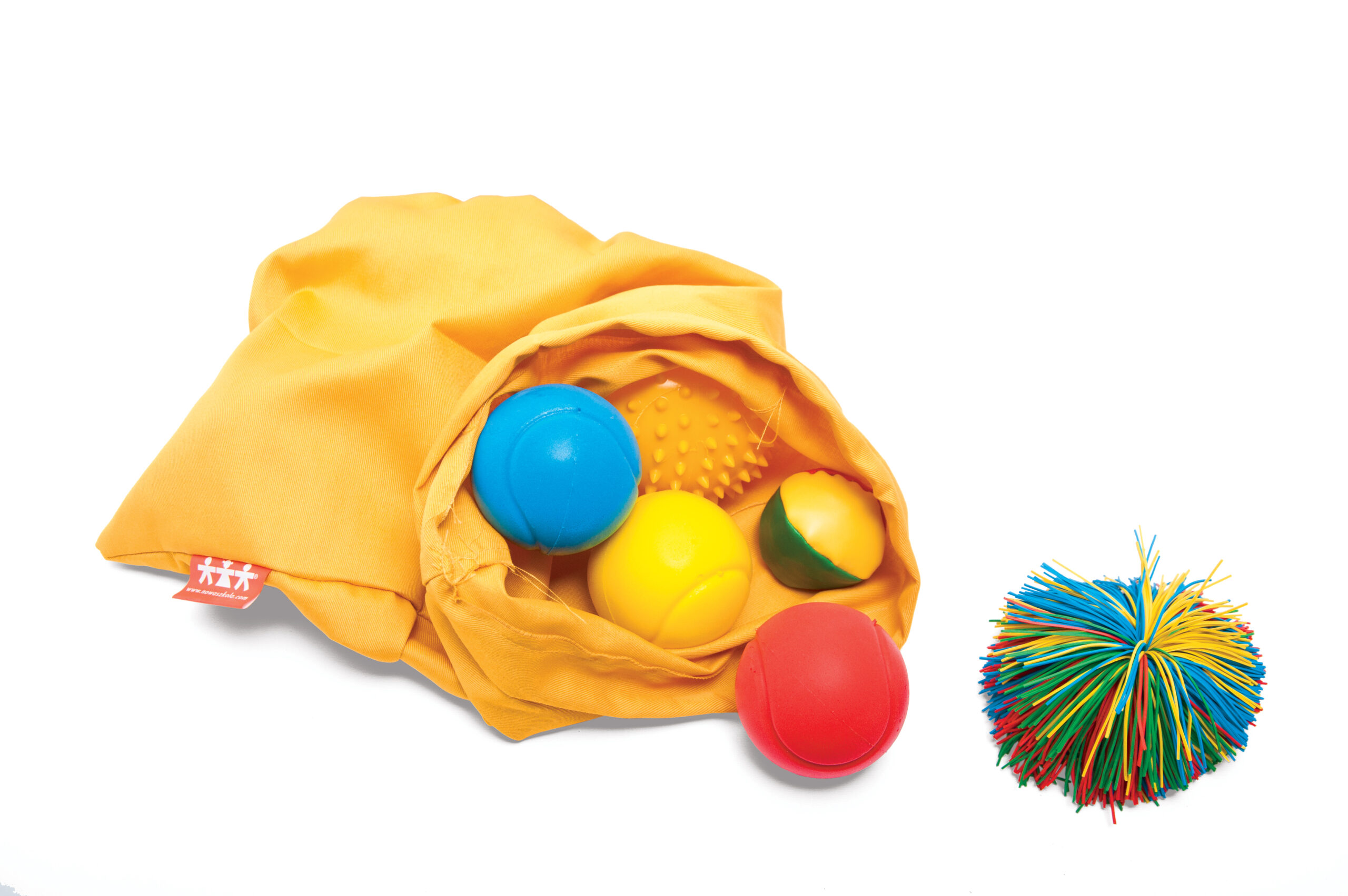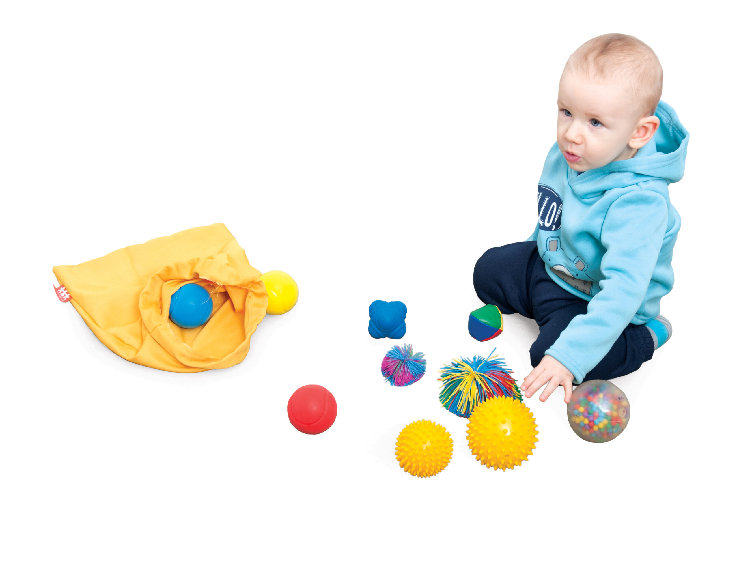 Set od 10 senzornih loptica: kuglice od perle, kuglice od pjene, hrapave lopte, kocke, cirkuske lopte, paučne loptice, vrećica za materijal.