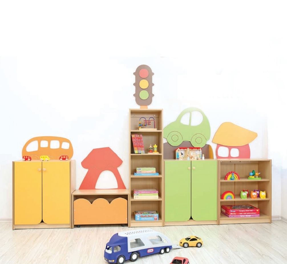 Set ormarića koji sadrže različite elemente. Ormarići s policama, ormarići s vratima, klupa s ladicom. Na vrhu svakog elementa nalazi se ukrasni element. Također, elementi mogu stajati samostalno i u sredini prostora. Leđa na zahtjev mogu biti pluto, ploča za kredu ili magnetna ploča za još bolju iskoristivost. Materijal: oplemenjeni bukov iveral i MDF.