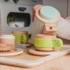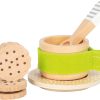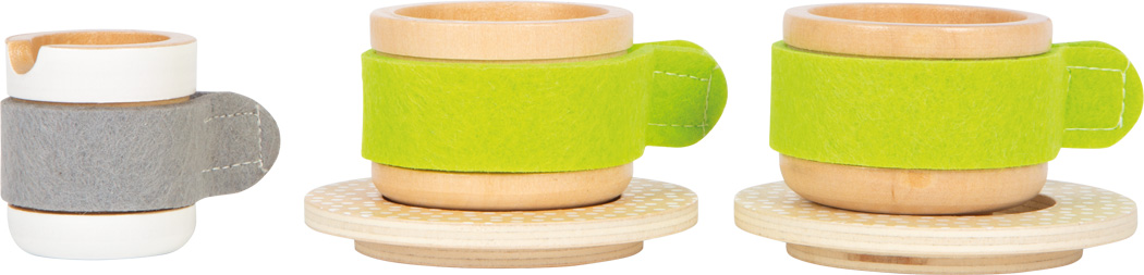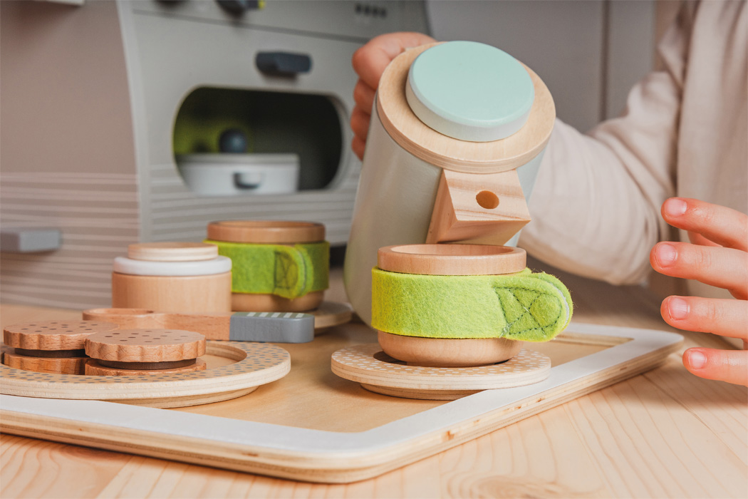 Set dolazi s velikim pladnjem, aparatom za čaj i kavu, zdjelicom za šećer, vrčem za mlijeko, žlicama, tanjurima s kolačićima i dvije šalice s tanjurićima te dvije kapsule za čaj i kavu. Navedeni sadržaji omogućavaju realističnu dječju igru.