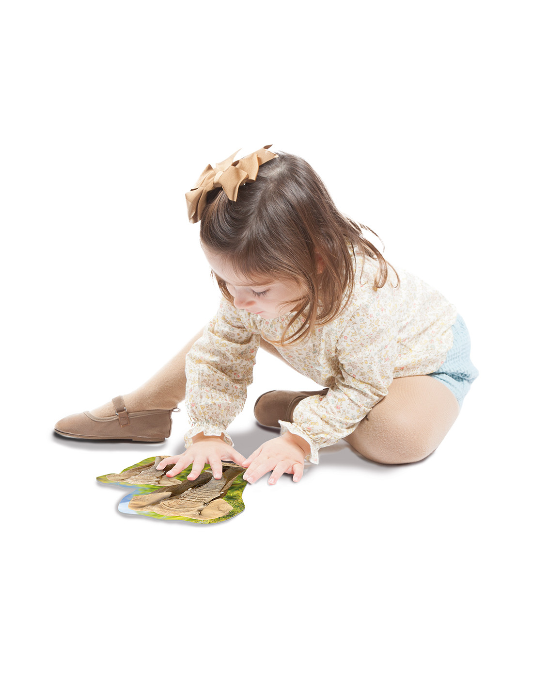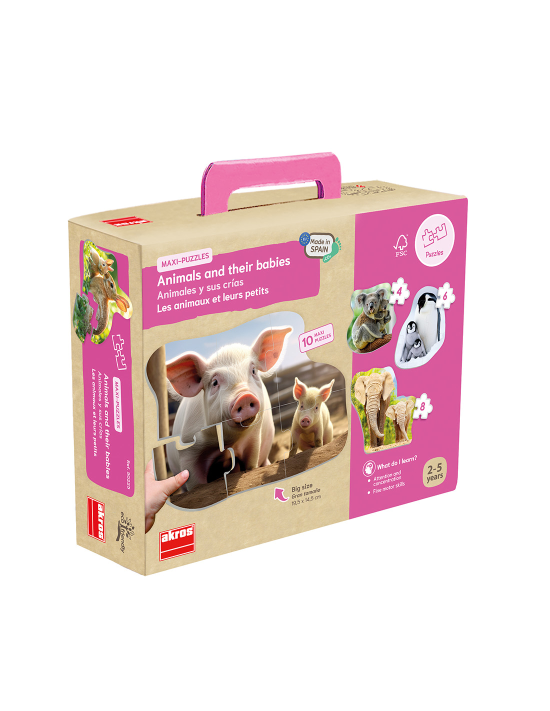 Set od 10 slagalica s realnim fotografijama životinja i njihove mladunčadi. Slagalice od 4, 6 ili 8 djelova. Izrađene od velikih komada, u maksimalnoj kvaliteti od debelog kartona dobivenog iz održivih šuma.
