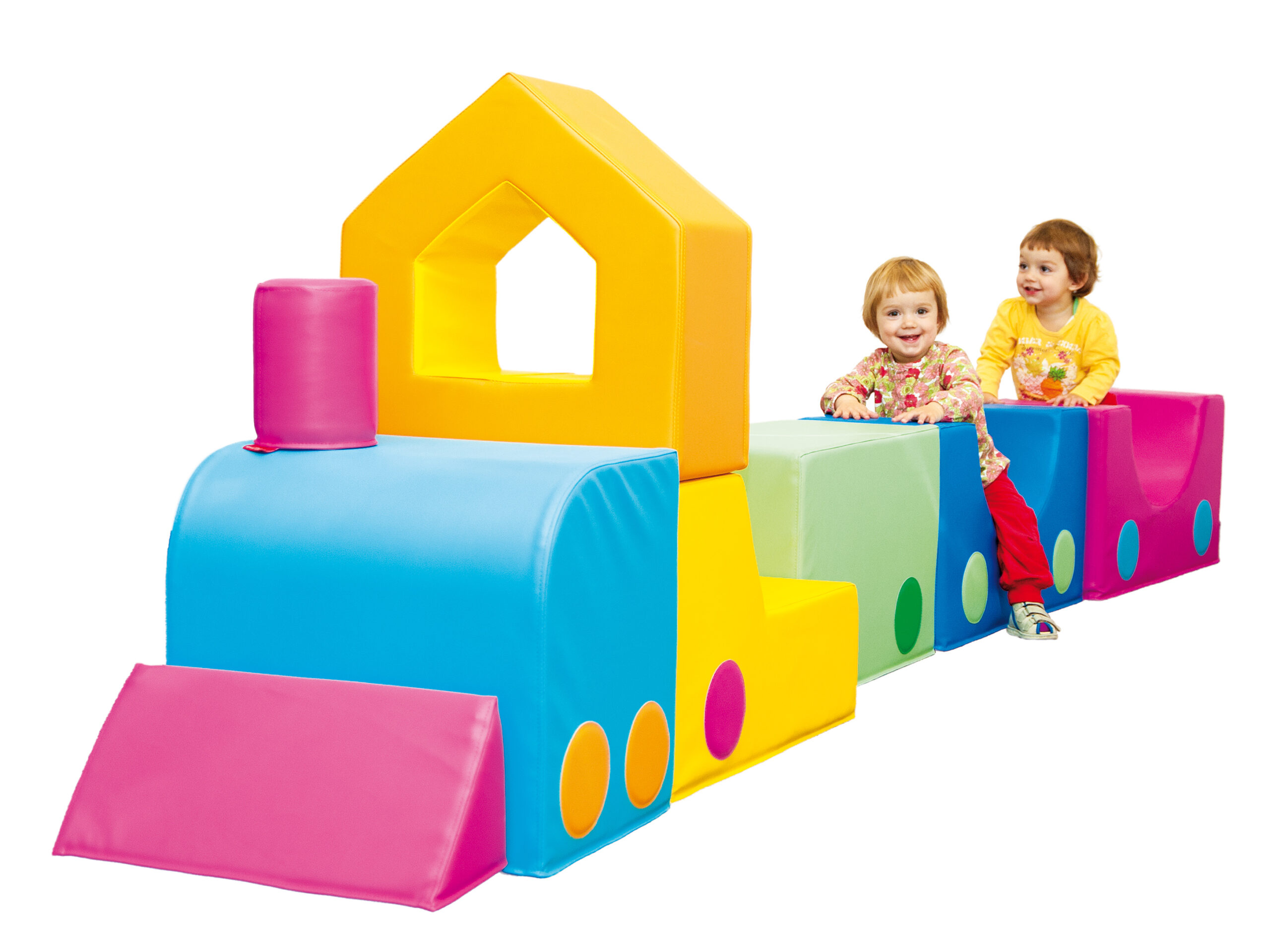Spužvasti element Šareni vlak sastoji se od osam elemenata presvučenim trajnom PVC tkaninom. Djeca se uživljavaju u radnju putovanja vlakom, ulogu putnika ili konduktera čime obogaćuju svoju maštu.