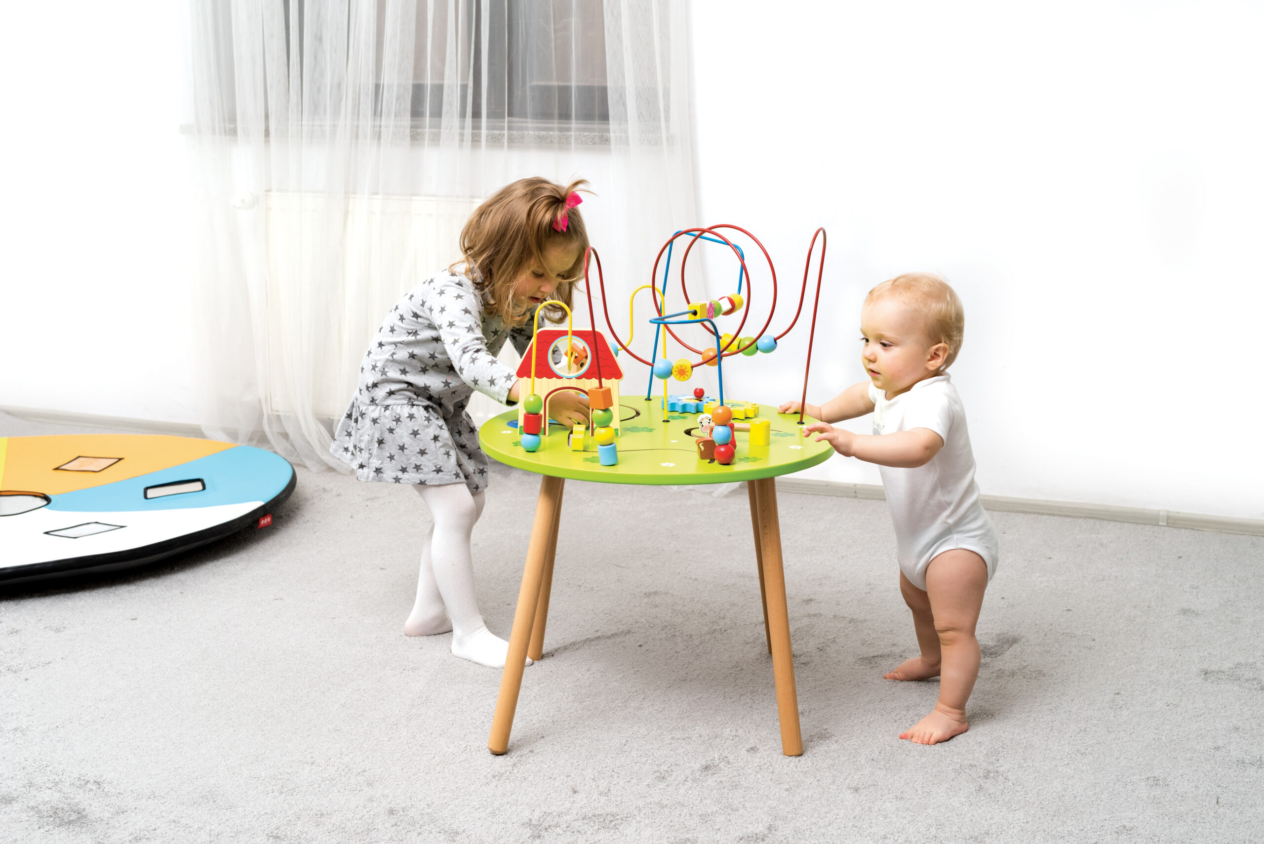 Stol s prekrasnom premetaljkom u kojoj se djeca starije jasličke skupine mogu zabavljati farmom, životinjama i traktorom te postaju mali farmeri u zapetljanoj žici.