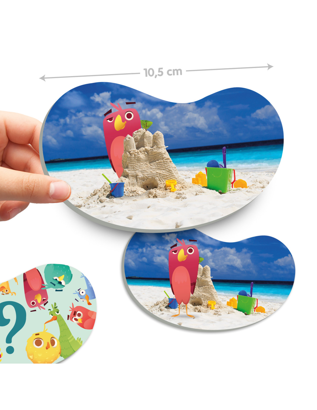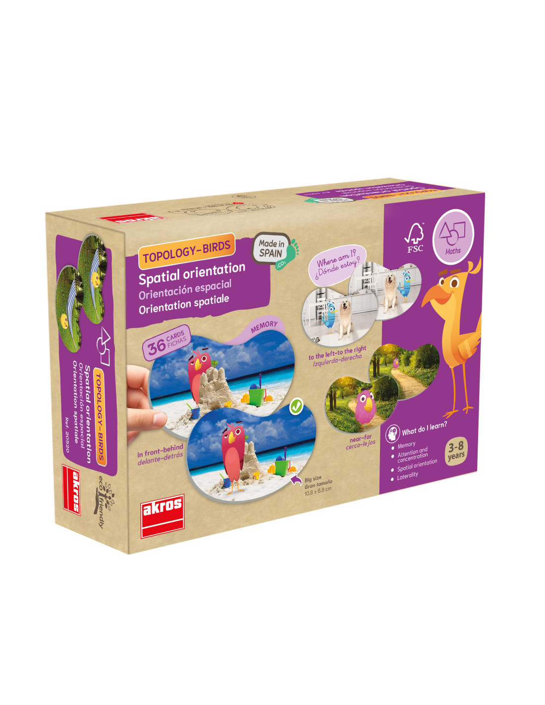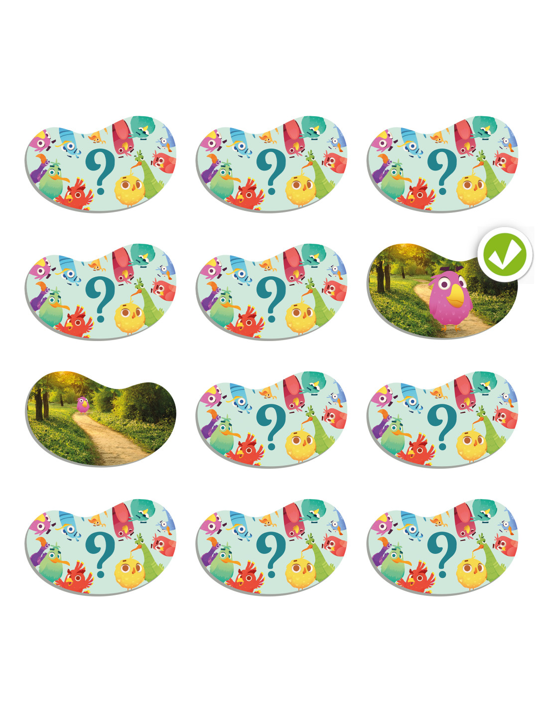 Originalna igra pamćenja za razvoj prostorne orijentacije i učenje suprotnih prostornih položaja: naprijed-iza, unutra-vani, na-ispod, desno-lijevo, blizu-daleko i zajedno-razdvojeno. Formirajte parove ptica u suprotnim prostornim položajima i testirajte svoje vještine promatranja i svoje pamćenje! Velike kartice sa stvarnim scenarijima.