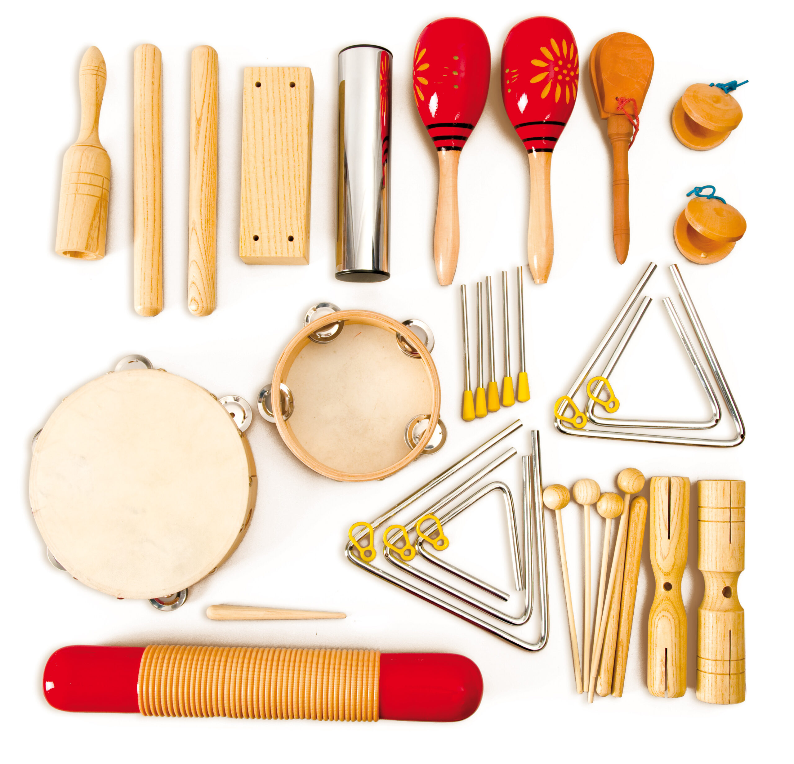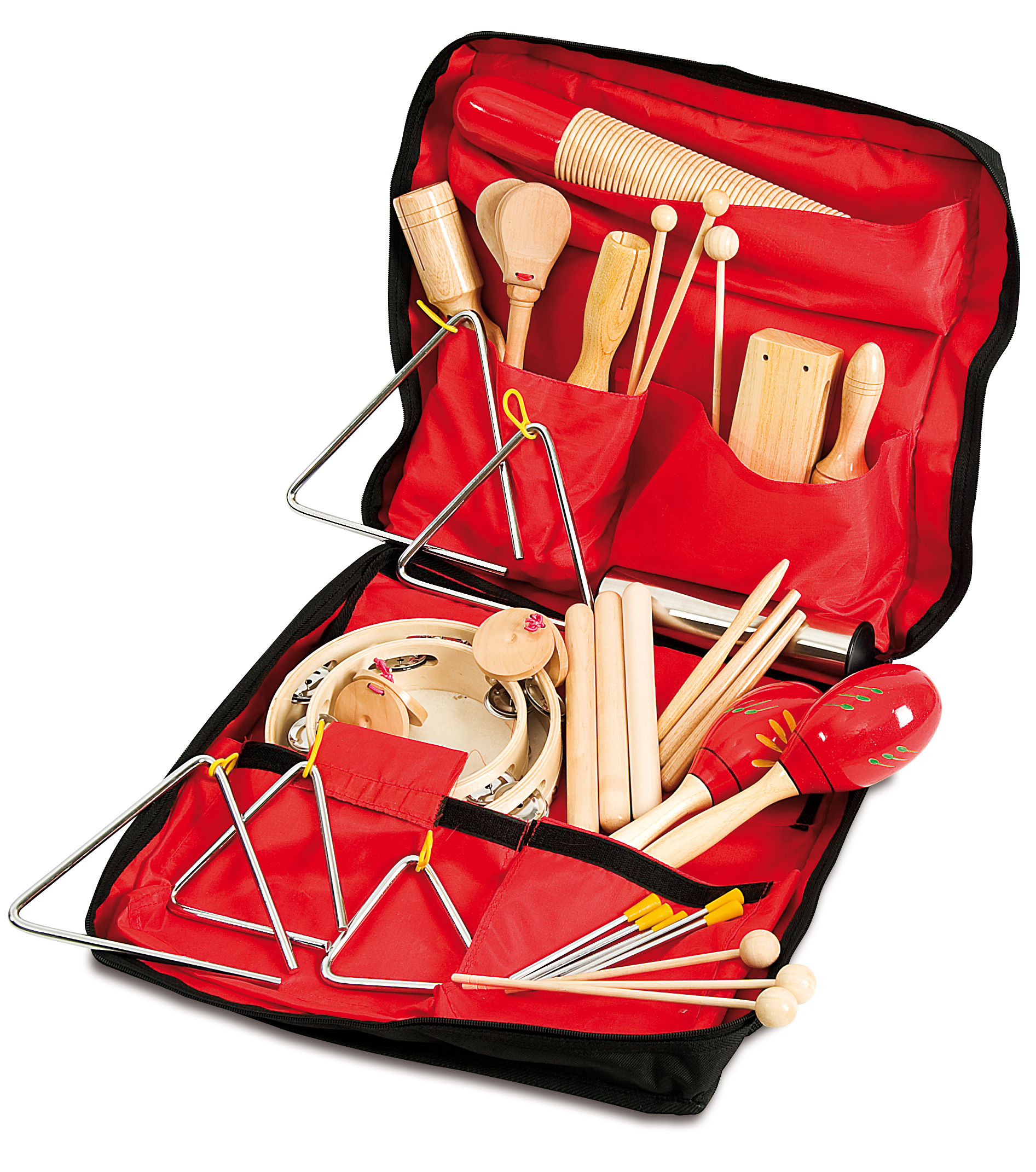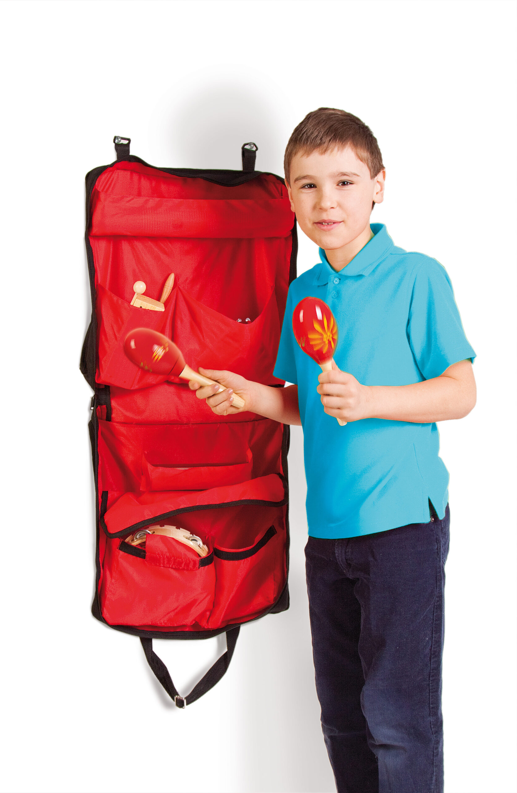Praktična torba s glazbenim instrumentima koja sadrži mnogo džepova. Izrađena je od izdržljive tkanine, zatvara se patentnim zatvaračem te se može obijesiti nakon otvaranja. Sadrži tamburu, tamburu s opnom, 5 triangla, 2 drvene marakase, veliki guiro, 2 tonska bloka i 1 tonski blok, akustičnu kutiju, 2 kastanjete, kastanjete s ručkom, metalni tresak i par klavesa.