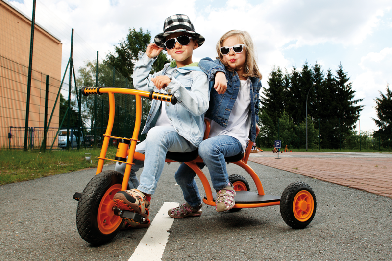 Tricikl Taxi 2 pruža udobnu vožnju za najbolje prijatelje. Dva sjedala postavljena su u nizu i nesklizajuća podloga daje sigurnost za trećeg putnika. Oba sjedala pružaju udobnost u vožnji.