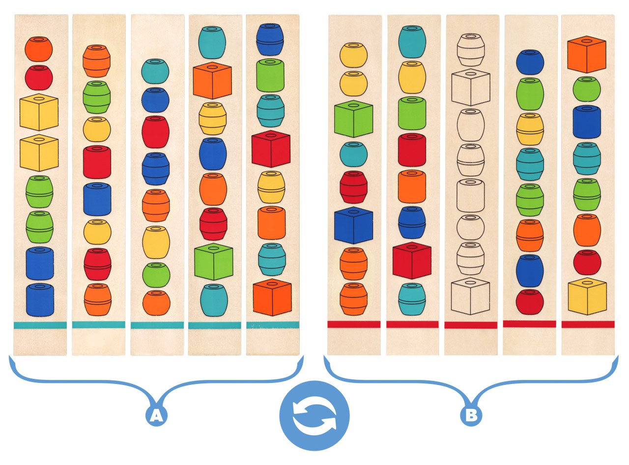 Djeca umeću šarene oblike u drvene štapiće kako bi kreirali uzorak s predloška. Predlošci su različitih težina. Potiče razvoj okulomotorne koordinacije djece, vizualne percepcije te razmišljanja.