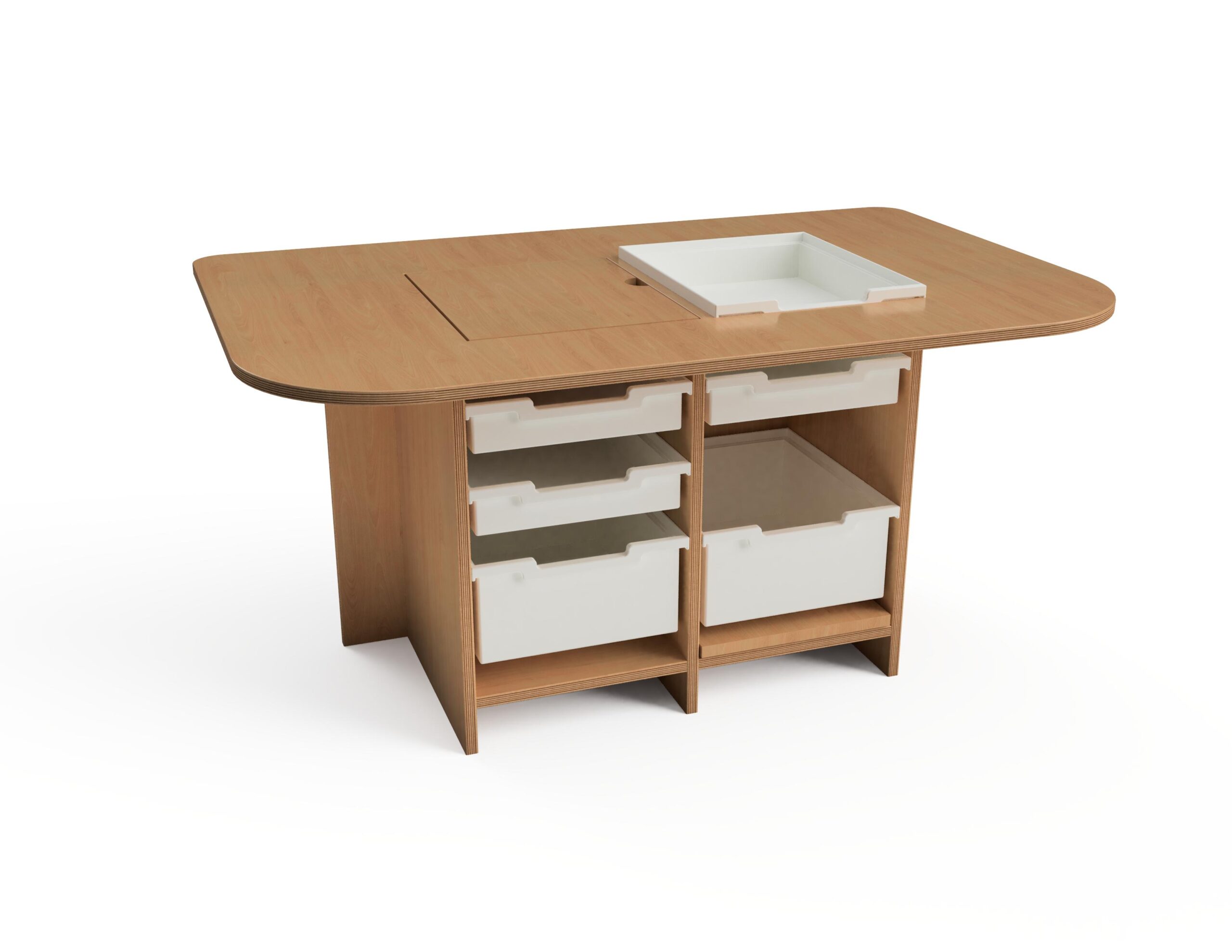Univerzalni stol s plastičnim kutijama, s dva otvora na stolu za umetanje kutije s materijalom za igru. Nakon igre kutija se posprema i stol zatvara posebnim vratima i dobiva se funkcionalna radna površina. Opremljena s 6 pari drvenih vodilica. Predviđena za 2 duboke (NS2330, NS2300, NS2301, NS2331) i 4 plitke (NS2304, NS2305, NS2334, NS2335) kutije. Izrađen od materijala po izboru u debljini od 18 mm. Spajan je bez vidljivih spojeva.