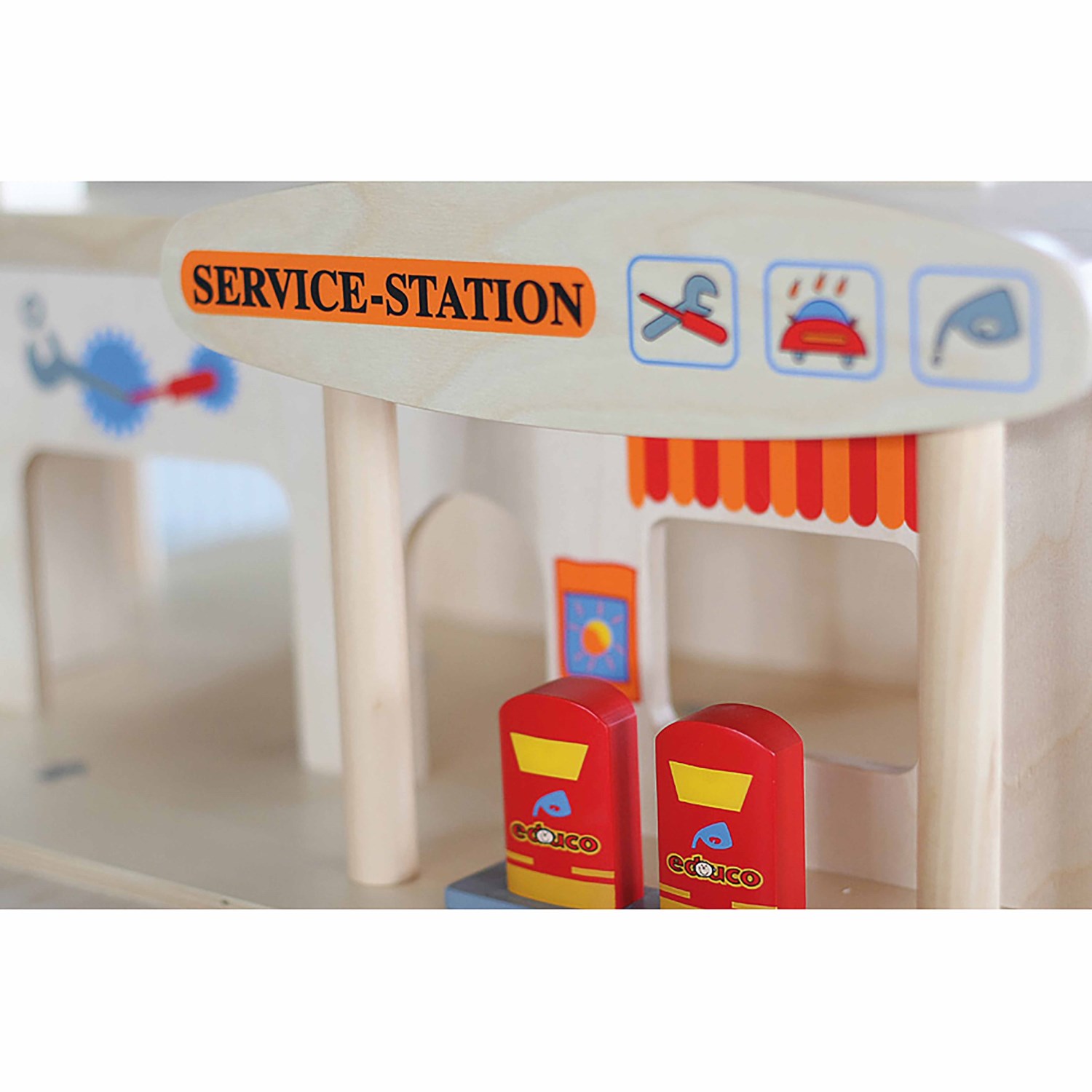 Drvena garaža s mnogo mogućnosti za igru: parkiralište, benzinska pumpa, dizalo automobila i servis radionica u prizemlju.