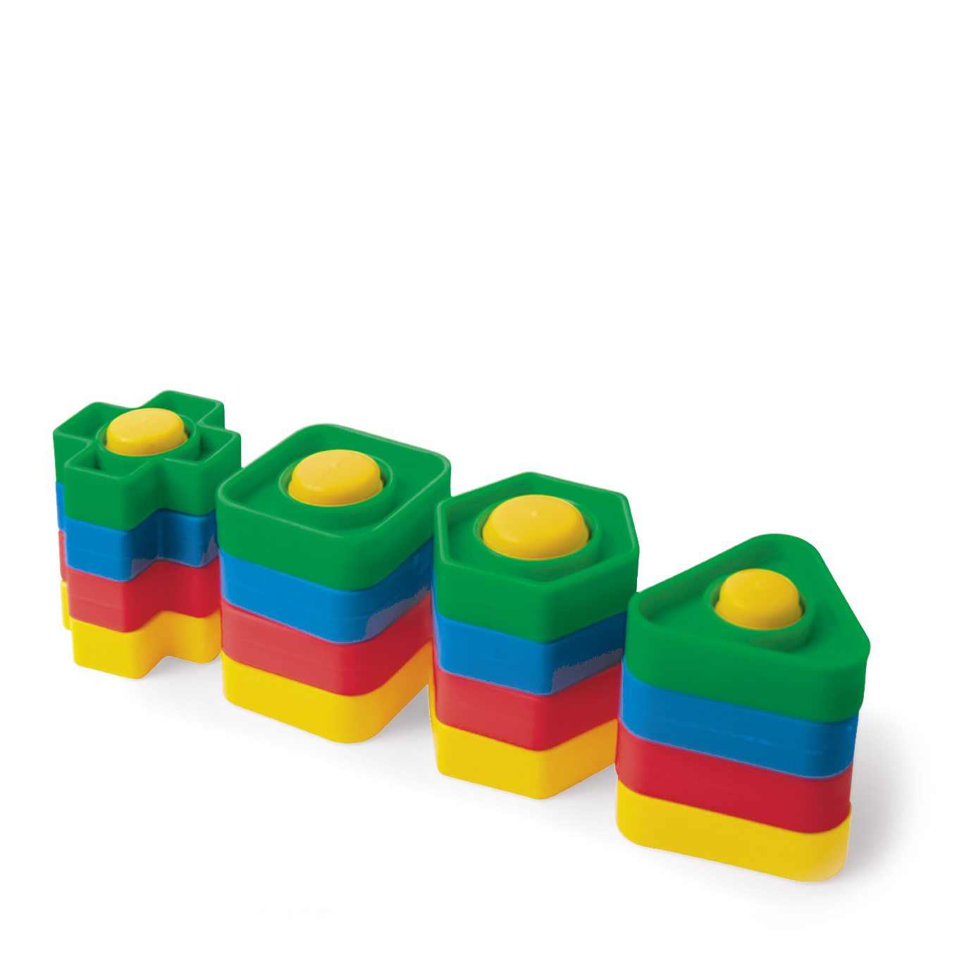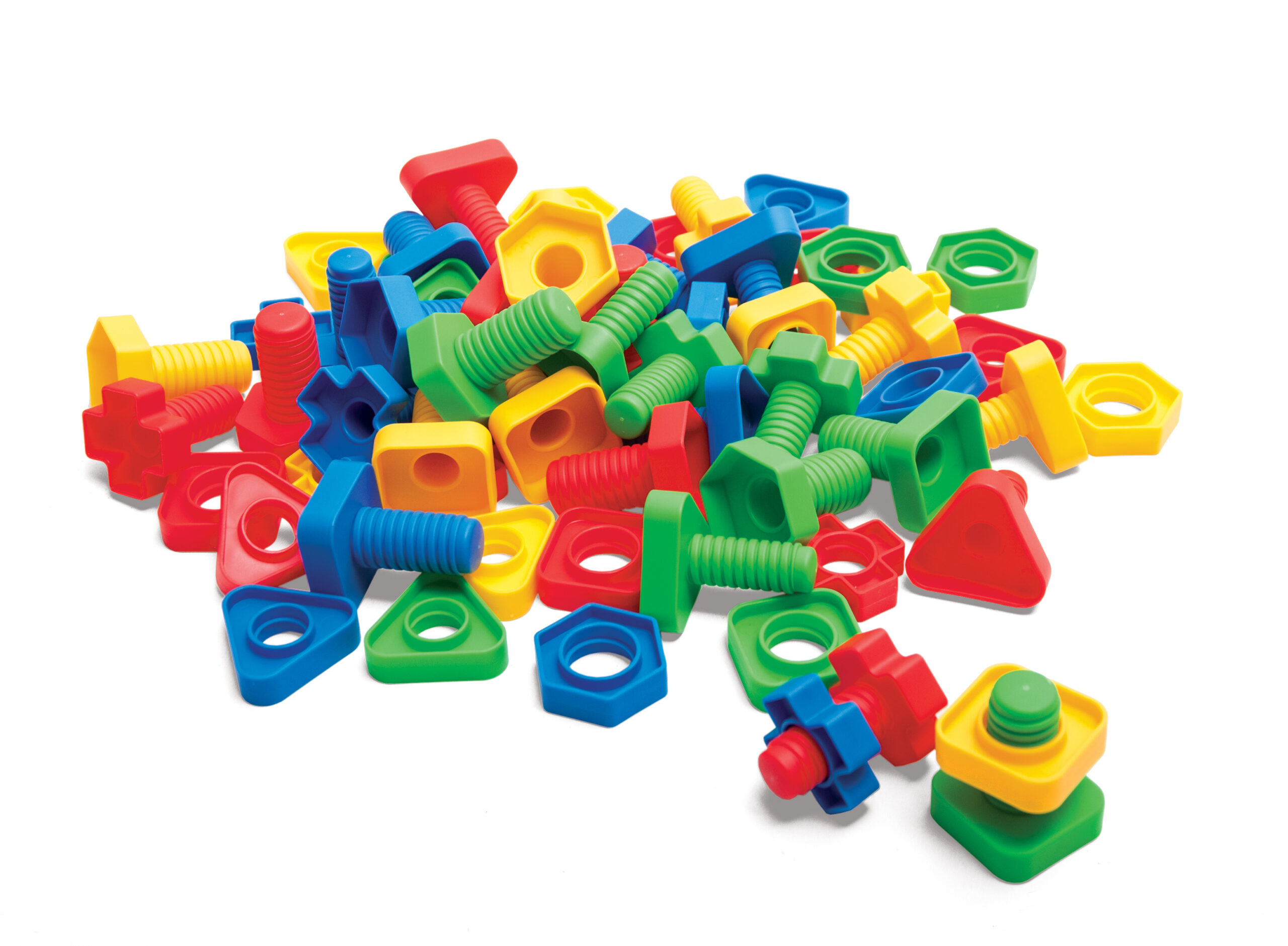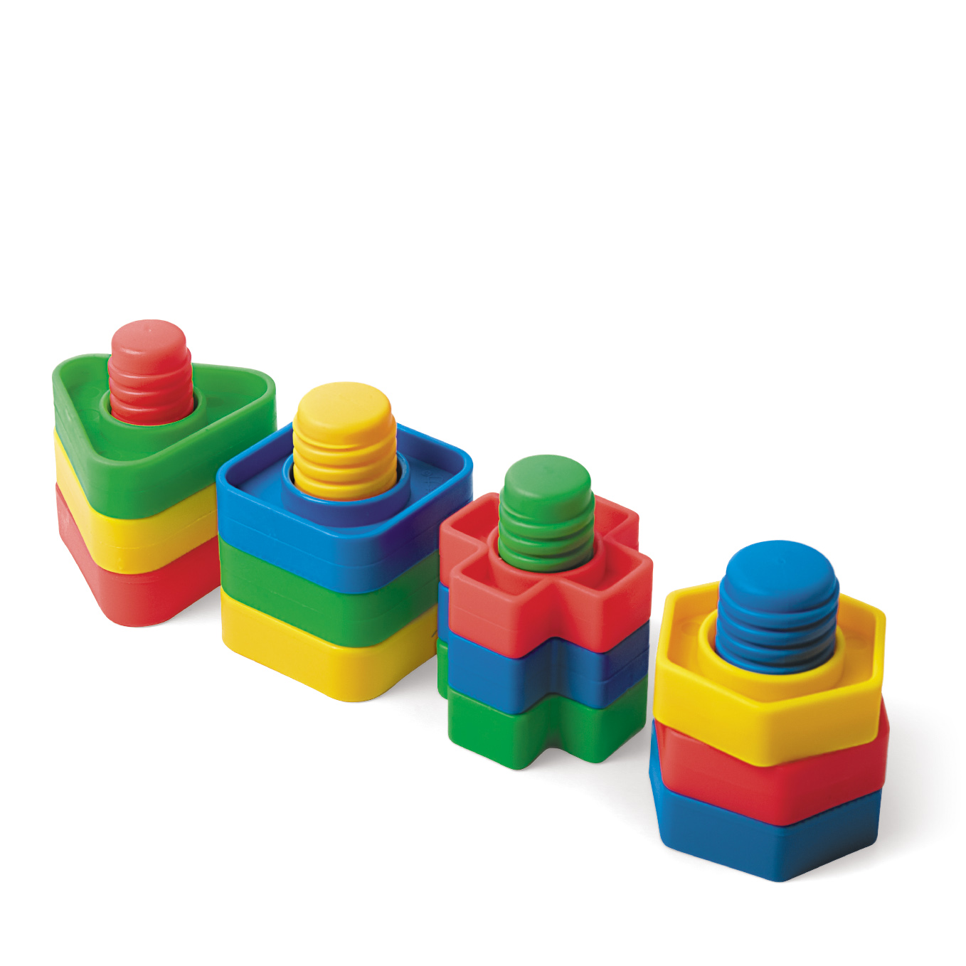 Skup šarenih blokova za manipulacijske igre. Kako biste spojili maticu s vijkom, pronađite bazu vijka istog oblika. Potiče koordinaciju ruku i očiju, percepciju i uči prepoznavanju oblika i boja.
