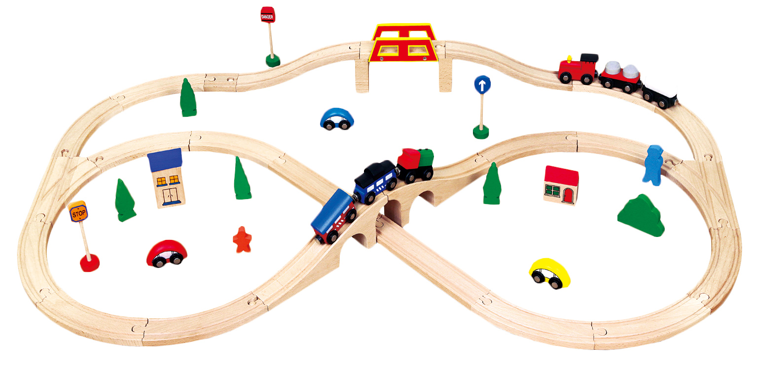 Magnetski spojen na dva vagona može voziti na bilo kojoj stazi. Komplet uključuje ravne i okretne kolosijeke, skretnice, spojnice, most, kuće, drveće, putokaze, 2 znaka, 3 automobila, lokomotivu i 2 vagona.