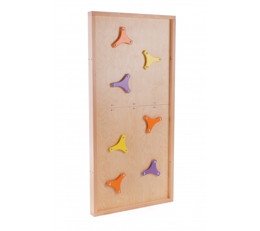 Zid za penjanje s raznobojnim i zanimljivim ručkama idealan za sportske dvorane i dječja igrališta. Izrađen od bukove šperploče. Jednostavno se montira. Ručke su obojene u žutu, narančastu i ljubičastu boju.
